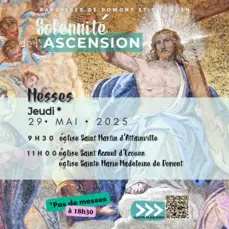 La fête de l’Ascension célèbre la montée de Jésus vers Dieu son Père. Elle est fêtée en France le jeudi de l’Ascension, quarante jours après Pâques. Mort et ressuscité, Jésus quitte ses disciples tout en continuant d’être présent auprès d’eux, mais différemment. Il promet de leur envoyer une force, celle de l’Esprit-Saint. La fête de l’Ascension, célébrant l’entrée du Christ dans la gloire de Dieu, est une des principales fêtes chrétiennes, qui s’inscrit dans le prolongement de Pâques et annonce la Pentecôte, dix jours plus tard. Le jour de l’Ascension, la couleur des vêtements liturgiques – que porte le prêtre – est le blanc, couleur de la fête, de la lumière et de la joie.