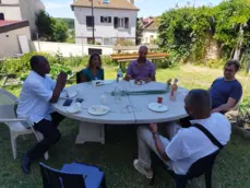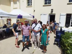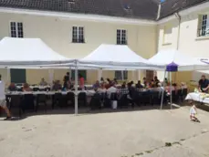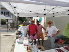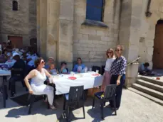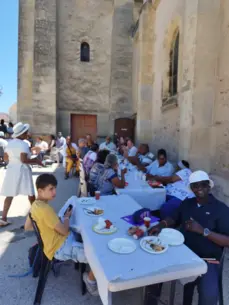 Après cette belle célébration ,la nombreuse assemblée s'est attablée tout autour de l'église ,devant la maison paroissiale et même dans le jardin du presbytère a l'abri du soleil torride pour déguster un succulent barbecue préparé par 4 maîtres grilladins et arrosé de quelques rosés bien frais .