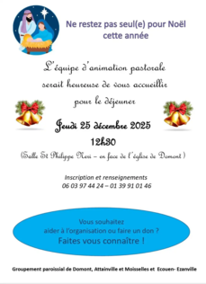 Participez au repas de Noel le jeudi 25 décembre à 12h30 à la salle Philippe Neri en face de l'église de Domont